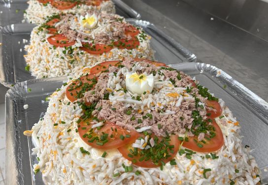 Pour vos entrées Christophe vous a préparé un gâteau de crêpes agrémenté de thon, salade, œuf, surimi, tomates, concombre et mayonnaise légère
