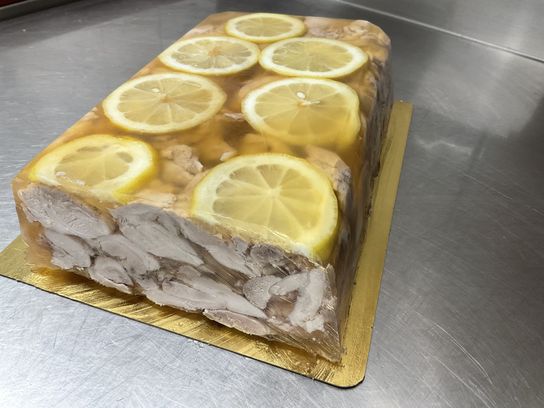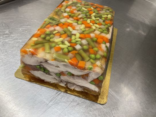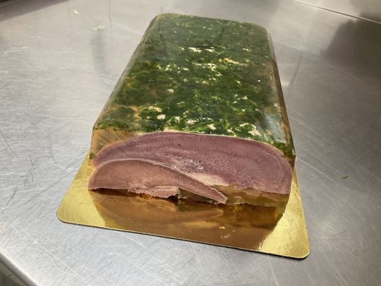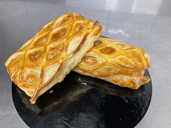 Farce de veau et de porc coupé au couteau, assaisonnée de vin blanc, échalotes et persil dans une pâte feuilletée.