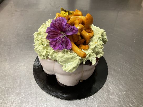 Pour votre plat, Christophe vous propose un melon d’agneau: gigot désossé agrément d’un beurre d’ail maison et de girolles