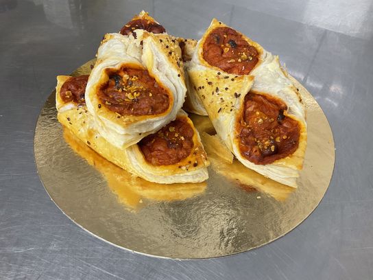 Pour vos petites faim Christophe vous a préparé un feuilleté garni sauce tomate maison, olives, tomates confites, lardons et jambon.